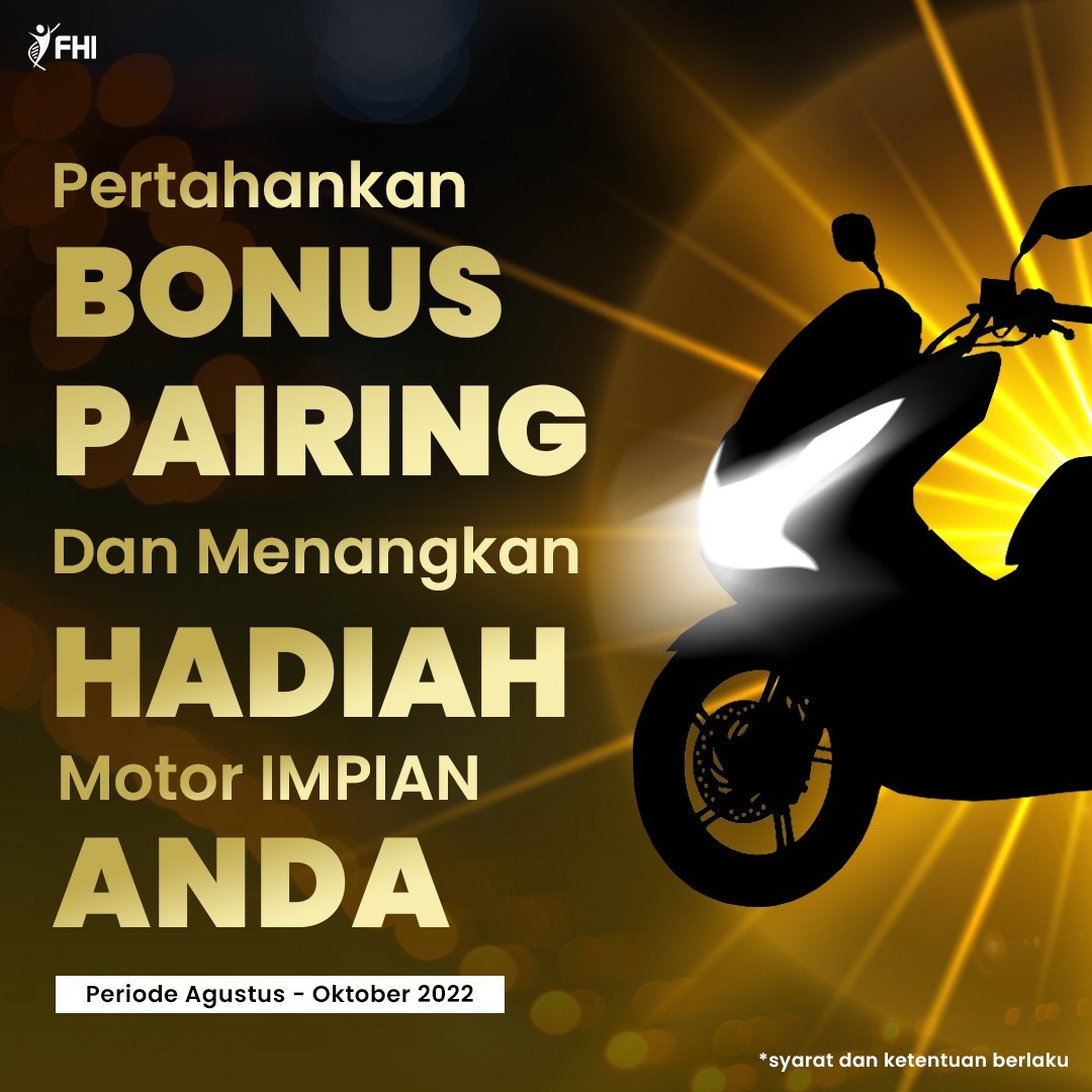 Memang menyenangkan kalau setiap hari selalu ada member yang berprestasi di FHI, dan hari ini sudah ada satu orang lagi qulified di bulan pertama untuk mendapatkan promo Motor.. bulan pertama ini sudah ada 11 org, dan ada 20 lagi yang mendekat untuk mencapai bonus pairing 3.5jt